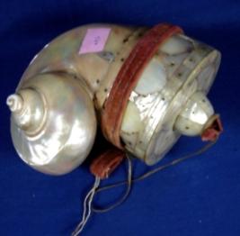 | Description / विवरण | Gun powder flask made of mother of pearl with velvet strap. The mouth has flower shape inlay work and embossed border. The cap is partly broken. |