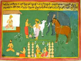 | Description / विवरण | Miniature painting based on Ekadashi Mahatmya depicting importance of Ekadashi vrat depicting that king Raghu got son by performing Ekadashi vrat. He also got boon by several donations of cows, horses, elephants and wealth. |
