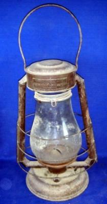 | Description / विवरण | Large oil lantern having wire handle, bulbous glass cover around the burner, two handles one at each side and wire supports around the glass cover. |