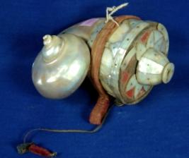 | Description / विवरण | Gun powder flask made of mother of pearl with cap and velvet strap. The mouth has floral inlay work and embossed border. There is a hole at the lower part and the inlay work is largely damaged. |