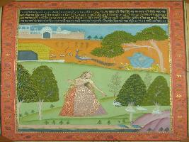 | Description / विवरण | Miniature painting based on Ragmala depicting Ragini Gauri of Rag Malkosh depicting on the top a nude yogini is sitting under a tree. The lower part depict Ragini withering in the garden in the pain of separation with Rag Hindol. |