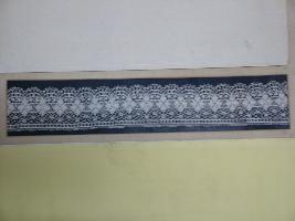 | Description / विवरण | Nottingham machine lace Dentella Mattese . It is a machine made cotton thread lace designed with floral designs. The upper margin border is designed in zigzag pattern. |