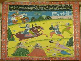 | Description / विवरण | Miniature painting based on Ragmala depicting Ragini Nata of Rag Bhairav depicting on the upper part men are fighting with each other, and at the lower part two yoginies collecting blood of human in a bowl. |