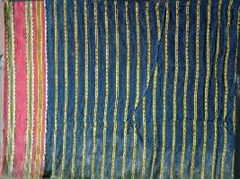 | Description / विवरण | This is Breast cloth blouse having silk and cotton border, along with thin horizontal line in yellow colour, with blue background. It has thick border and divided into three horizontal sections-one is plane and other two has geometrical design with green, yellow and white colour. Its background is red colour. |