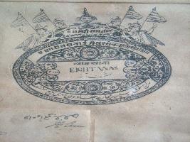 | Description / विवरण | A Jaipur stamp print, value of four eight annas. It has four human half figures holding flags on the top with Shri Ramji printed in the centre. |