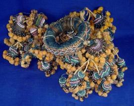 | Description / विवरण | Decorative Pitghar Pitcher support worn on head. It is circular in shape and having three rows of multi- tiered hangings made of multi coloured beads of various sizes and cotton threads of green and orange colours. |