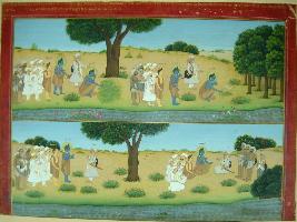 | Description / विवरण | Miniature painting based on Ramayana depicting Bharat and Shatrughana going in search of Shri Ram and meeting king Guha and his men and asking about Shri Ram. Above this, king Guha takes Bharat and Shatrughana to a spot where one ornament of Sita was left. He is shown holding that ornament. |