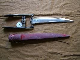 | Description / विवरण | Instrument of point is known as Katar. It has sharp cutting edge on both side and little bend at the top with a mid rib pointed tip. Its handle is having two rod parallel joined by a horizontal rod which is decorated with golden inlay work of floral and cripper motifs. It is provided with a cover. |