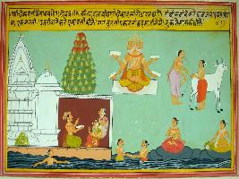| Description / विवरण | Miniature painting based on Ekadashi Mahatmya depicting the importance of Ekadashi vrat and the process to perform it on the bank of holy rivers. |