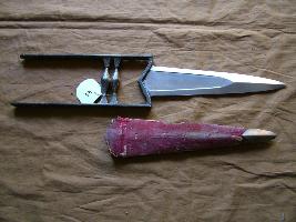 | Description / विवरण | Weapon of point is known as Katar, it has sharp cutting edge on both side, with a mid rip pointed tip. Its handle is having two rod parallel joined by a horizontal rod decorated which is decorated with golden inlay work of floral and cripper motifs. it is provided with a cover. |