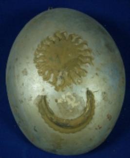 | Description / विवरण | Oval shaped iron helmet painted with silver colour on the exterior and has embossed seen and moon design. The inner side is plain. |