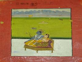 | Description / विवरण | Miniature painting based on Ramayana depicting Ram and Sita sitting on a throne, under a canopy. Ram is depicted holding bow and arrow in his hand. |