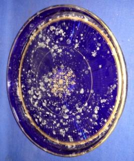 | Description / विवरण | Circular plate made of precious stone having golden floral designs in the centre. The rim is vertical and back side has incised lines. |