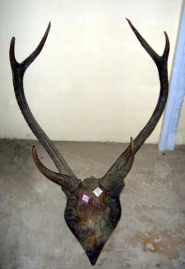 | Description / विवरण | Part of Reindeer skull with large branched horns. The skull is partly broken and kept on a wooden plaque. |
