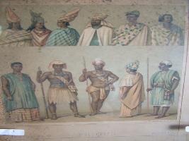 | Description / विवरण | Africa. Dress in Senegal. 1, 2 and 3, regresses of Senegal, 4, Moor of Senegal. His turban is of silk and his mantle of cotton. 5 and 6 Negros in long cotton mantles, 7 Negros, the little bags hanging from his neck contain charms, 8 and 9 Teedos or soldiers. |