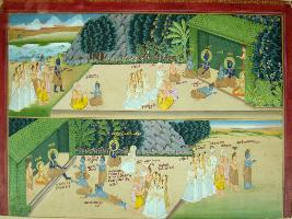 | Description / विवरण | Miniature painting based on Ramayana depicting a scene of Chitrakuta where Ram, Lakshman and Sita are living during the time of exile. Ram s younger brother Bharat and his family members are seen and their meeting with Ram on the upper part of the painting, while on the lower part of the painting Bharat is seen and he takes Ram s charan paduka sandal and returns back to Ayodhya. |