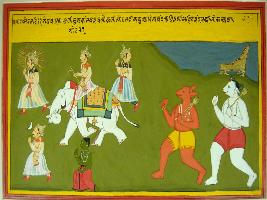 | Description / विवरण | Miniature painting based on Ekadashi Mahatmya depicting Ekadashi worship of Migsar month depicting Lord Indra, Vayu, Surya and Chandra coming on earth when a demon captured the heaven. |