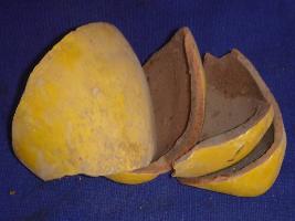 | Description / विवरण | Mango made of clay, yellow in colour, broken into four pieces. |