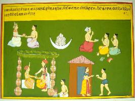 | Description / विवरण | Miniature painting based on Ekadashi Mahatmya depicting the fruitfulness of Ekadashi vrat of Migsar month. A pundit depicts that in this month Bhumi daan, Kanyadaan, Vidya daan, Annadaan food and jaldaan pays back good result. |
