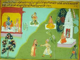 | Description / विवरण | Miniature painting based on Ekadashi Mahatmya depicting the importance of the Ekadashi of Bhadav month. The painting depicts Yudhisthir asking Krishna about the Ekadashi and Krishna said that worshipping of Krishna in this Ekadashi will help to get rid of all sins. |