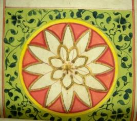 | Description / विवरण | Miniature painting depicting a big floral design on a pink coloured base. Vine and blossom designs are seen around it. |
