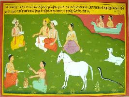 | Description / विवरण | Miniature painting based on Ekadashi Mahatmya depicting Ekadashi of Migsar month depicting the importance fruit fullness of worship on that auspicious day. |