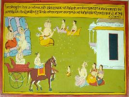 | Description / विवरण | Miniature painting based on Ekadashi Mahatmya depicting Ekadashi of Magh month depicting a king asking sage about the worship and sage ask him to perform Ekadashi vrat. Sage also tells him about the fruitfulness of the Ekadashi vrat. |