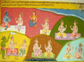 | Description / विवरण | Miniature painting based on Ekadashi Mahatmya depicting Ekadashi of Kartik month depicting Yudhisthir asking Krishna about the name of Ekadashi and Krishna said that it is Ram Ekadashi. Krishna also tells him about the story of this Ekadashi. |