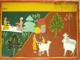 | Description / विवरण | Miniature painting based on Ekadashi Mahatmya depicting Ekadashi of Bhadav month. It depicts the importance of fruitfulness of worship on that auspicious day. Two men is performing vrat at top right part. At the lower left, both of them, taking Gomutra from cow. |