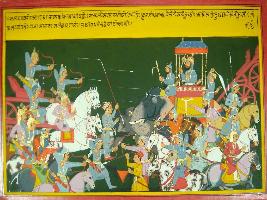 | Description / विवरण | Miniature painting based on Mahabharat - Shalya parva depicting death of Shalya and heavy war between Kaurvas and Pandavas. Later king Salva come on elephant for fight. |