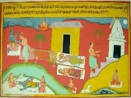 | Description / विवरण | Miniature painting based on Ekadashi Mahatmya depicting Ekadashi of Bhadav month depicting the importance of fruitfulness of worship on that auspicious day. |