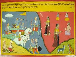 | Description / विवरण | Miniature painting based on Mahabharat - Shalya parva depicting a Mahabharat war, Yudhisthir is depited killing Shalya with a spear. On the other side Shiv, two women and a sage along with a deer and tiger is depicted. |