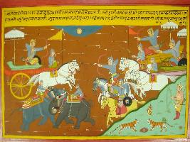 | Description / विवरण | Miniature painting based on Mahabharat - Shalya parva. Shalya has been wounded by an arrow from Yudhisthir. The fight is compared as two lions are being fighting. |