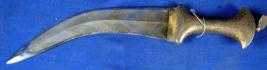 | Description / विवरण | Jamia dagger having curved blade made of faulad with water marks in V shape. The iron handle has incised floral pattern. |