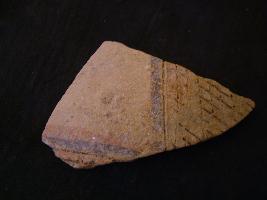 | Description / विवरण | It is a well faired medium fabric red ware. It is treated with black and red colour bands. It has got criss-cross incised decoration. It is associated with OCP. |