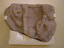 | Description / विवरण | This is a partly broken figure stone sculpture of a demi god. He holds a Dand in his right hand and has a good head gear. One human head is visible besides it. Other things are not visible clearly. |