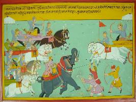 | Description / विवरण | Miniature painting based on Mahabharat - Shalya parva. Shalya is depicted fighting with Yudhisthir and other. Satyaki has suffered ten wounds of arrow, Bhim and Sahdev also wounded and at last Yudhisthir also wounded by arrow. |