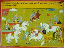 | Description / विवरण | Miniature painting based on Mahabharat - Shalya parva. Yudhisthir is depicted fighting fieraly and he is crushing every thing coming to his way, he is killing enemy like Shiv killing demons with trishool. |