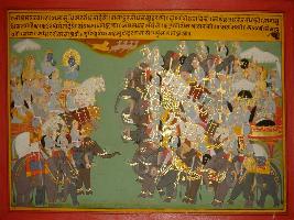 | Description / विवरण | Miniature painting based on Mahabharat - Bhishma parva depicting that king Yudhisthir and Duryodhan are on either sides. Duryodhan is amazed to see their army. Both of them blow conch and then the war started. The war is like lion chassing deers. |