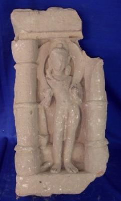 | Description / विवरण | Independent sculpture of Bhairav in standing position in pillared niche. His face is defaced and he is holding the tussle of his drapery with both hands. His vahan dog is seen behind his leg at right side. The left pillar is broken on the upper part. |