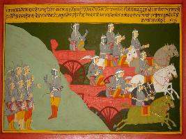 | Description / विवरण | Miniature painting based on Mahabharat - Shalya parva. The painting depicts Pandavas and Krishna, Yudhisthir says that tommorrow he will fight with Shalya and then the Pandavas are making the strategy against Shalya. |