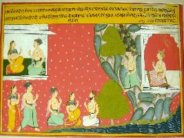 | Description / विवरण | Miniature painting based on Ekadashi Mahatmya depicting the importance of Ekadashi vrat of Kartik month on upper part one couple is depicted on lower side, three man with 2 women is depicted. |