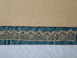 | Description / विवरण | It is a machine made lace made in Ceylon. Two intersecting wavy lines with fine thin net. The edges are triangle. It is a geometrical design. The edge line is bottom straight and top portion border wavy lines. |