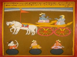 | Description / विवरण | Miniature painting based on Shri Bhagwat Gita. On the painting Krishna asking Arjun about Kama Krodh Lobha Moha and he says that a man should always try to avoid there things. |