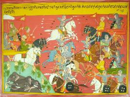 | Description / विवरण | Miniature painting based on Mahabharat - Drona parva depicting Duryodhan is talking to Karam about leader ship of Dronacharya in war. |