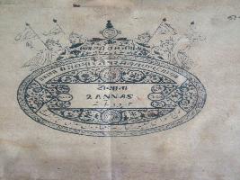 | Description / विवरण | A Jaipur stamp print, value of two annas. It has four human half figures holding flags on the top with Shri Ramji printed in the centre. |