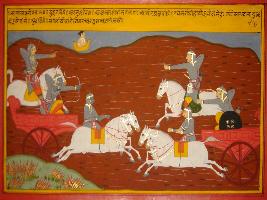 | Description / विवरण | Miniature painting based on Mahabharat - Shalya parva depicting Arjun fighting with Ashwathama. A gandharva is seen the fight from the sky. |