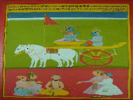 | Description / विवरण | Miniature painting based on Shri Bhagwat Gita. It depicts Krishna preaching Arjun that maan and apmaan is similar to friend and foe. So one has to leave them in start only. |