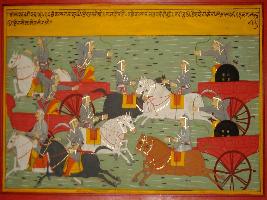 | Description / विवरण | Miniature painting based on Mahabharat - Shalya parva. The painting depicts a very hot battle in between Shalya and Yudhisthir and by seeing the fight the soldier are began to ran away. |