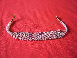 | Description / विवरण | It is a necklace of small glass beads in white and pink colour. Four strings of necklace, dividing into many layers in criss-cross pattern. |